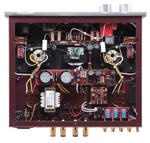 本機は初段とドライバー段に12AU7×2本と12AX7×1本が採用され、出力段のKT150はシングルのウルトラリニア(UL)接続が採用されている。大型管であることに加え効率の良い方式のため、シングルで18W+18Wという大出力を発揮、周波数特性も特に高域62kHzまでよく伸び、S/Nも90dBというからソリッドステートと遜色ない。