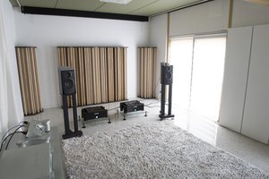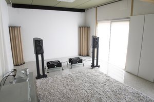 実は、音楽をかける前の段階で会話の声がかなり反響し、手を叩くとフラッターエコーがしている。シンプルで美しい部屋にありがちな響きだが、ここまで酷い状態でどこまで改善できるのだろうか。