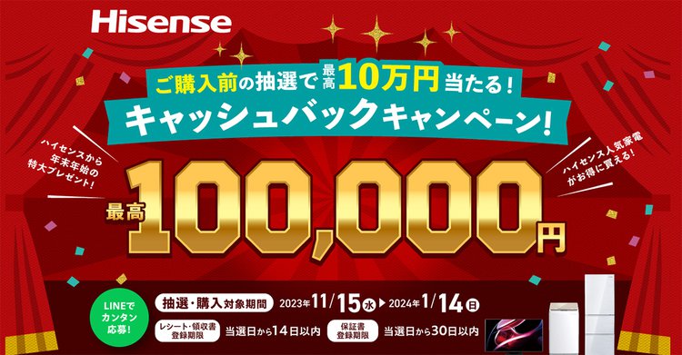 現在ハイセンスでは、最大100,000円をキャッシュバックするキャンペーンを実施している。本キャンペーンでは、まず対象商品購入前にハイセンス公式LINEアカウントを友だち追加。そして購入予定商品が対象となるコースを選択し、アンケート回答して抽選に参加すると、その場で抽選結果が分かる。抽選および購入対象期間は2024年1月14日(日)まで。