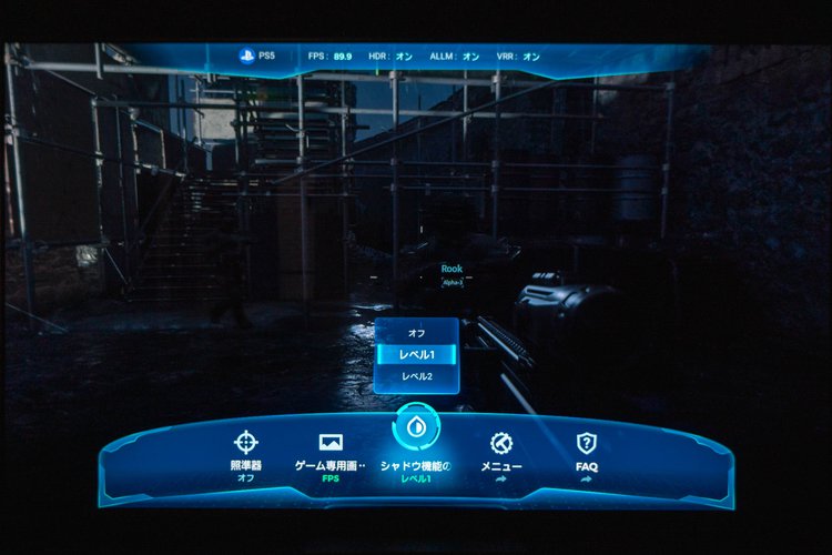 『Call of Duty:Modern Warfare III』は、さまざまなプレイモードがあるが、「キャンペーン」で緊迫感のある戦闘とシネマティックな映像をプレイしてみる。冒頭の潜水艦シーン、タクティカルヘッドランプとフラッシュランプの光の再現でも、輝度表現とコントラスト性能の良さが判断できるレベル。プレイを進めていくとのその画質の良さは強烈で、暗闇の中で敵の姿を探す際もコントラストと階調の高さを実感。暗視スコープを使って降下していくシーンも、暗部階調が適した表現になっている。