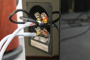 ここでスピーカーをFS247BEへチェンジ。FS247BEのバイワイヤリング端子は横から見てS字にかたどられたショートバーが用いられている。これをSJP-10に置き換えるが、ターミナルと接点の周りに抑えとなる樹脂パーツがあり、Yラグ端子が干渉するケースもあるようで、注意が必要だ。ジャンパーケーブルのYラグ側とスピーカーケーブルのYラグを重ねつつ導体にストレスのかかりにくいポイントを探して装着しておきたい。