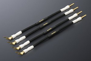 なお外装やプラグについてはSJP-10、SJP-1ともに共通で、制振材入りポリオレフィンシースとオリジナルの金メッキ端子を取り入れている。介在には静電気対策に加え、広帯域でエネルギー損失の少ない伝送を実現する、低静電容量なシルクを採用。ケーブル外径はφ11mmで、長さは一本あたり20cmだ。標準仕様では端末の一方がバナナプラグ、他方がYラグ端子としているので、元々使用していたスピーカーケーブルの端末と干渉しにくいものとなっている。