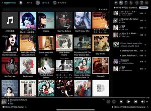 まずはAmazon Musicから。日本語での検索ができることがひとつの強みなので、検索ウインドに “ノラ・ジョーンズ”とカタカナで入力した。するとアーティスト、アルバム、楽曲のアイコンが表示され、他社の多くのアプリとは違い、アルバムアートが美しくタイル表示されるではないか!これはすごい。
