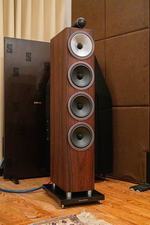 705 S3に続き、シリーズ最上位の702 S3を聴く。16.5cmウーファー3基+コンティニュアム・ミッドレンジとカーボンドーム・トゥイーターの組み合わせはシリーズ最強の構成で、バスレフポートはダウンファイアリング方式を採用。背が高く、立派なたたずまいで、20畳の試聴室に設置しても抜群の存在感を発揮する。