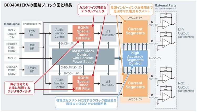出音の良さということについては「BD34301EKV」は32bitの解像度、THDは-115dB、SN比は130dBと高性能DACチップとしての数値性能も高いが、単にスペックに振ったICではないという点にポイントがある。DACチップはデジタルとアナログの両面を兼ね備えるICだが、「BD34301EKV」ではアナログとデジタルの両方で特にオーディオ的なこだわりが設計に込められている。