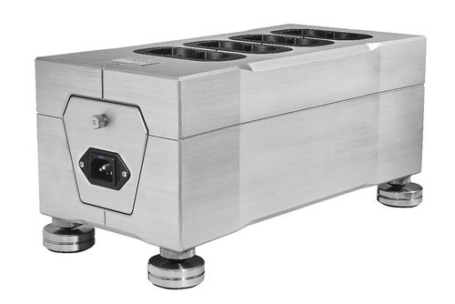 美しいアルミブロック切削筐体に魅せられる。私的にはパワー・コンソールと呼びたくなるほど壮大だ。筐体は3ピース構造で、上部に「NCF Booster-Brace」が組み込まれ、内部に、フラグシップの2連コンセント「GTX-D NCF(R)」を4式、IECインレット「FI-09 NCF(R)」1式を設置したコンセントベースおよびプレートを配置。下部には重厚なボトムケースがあり、電磁波吸収材、GC-303を採用。
