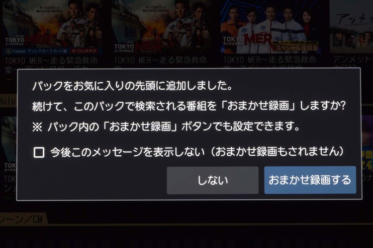 おまかせ録画は非常に優秀だ。試しに中学生の娘が推しのアイドルグループ を登録したところ、冠番組や出演ドラマだけでなく、ゲストで登場した番組も録画されていた。何より喜んだのが、推しメンバーがソロで数分取り上げられた朝の情報番組まで網羅されていたことだ。