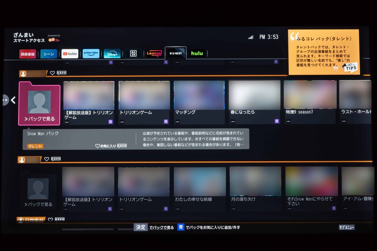 新「ざんまいスマートアクセス」は、ジャンルやタレントごとに番組をパッケージにした「みるコレ パック」を設定しておくと、選んだテーマに応じた録画番組やシーン、そしてネット動画の関連コンテンツもシームレスかつ自動でピックアップしてくれる機能で、推しの作品や好きな番組に集中して視聴することができる。