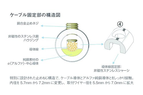 この構造の特筆すべきことは、ケーブル導体が接触する中心導体部にα純銅素材を、そして非磁性ステンレス材のクランプによって銅合金止めネジとしたことだ。