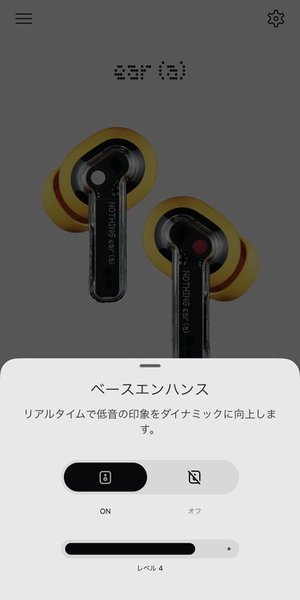 専用アプリからイコライザーでの音質調整も行えるが、注目したいのが「ベースエンハンス」機能。ただ低域が持ち上がるだけでなく、「ズンズンくる」感じの低域に質が変わる、というイメージだ。デフォルトのライトめな聴き味とはかなり印象が変わって面白い。