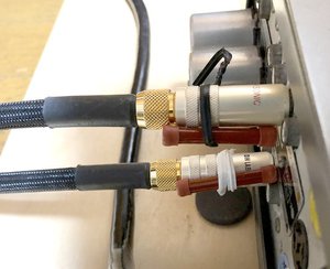 特別な塗料、セラミックス、麻、絹、オイルなどで作られている「篳篥・朱」。ケーブルの入力側に取り付けると再生音に生々しさが付加されるという。SACDプレーヤーとプリアンプ間を繋ぐアナログRCAケーブルのプリ側端子に取り付けて聴いてみた。