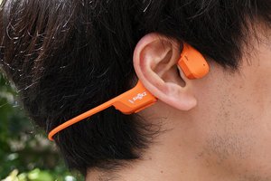 実際に装着してみると、形状の良さとソフトシリコン素材の肌触りの柔らかさによって、イヤーフック部の耳へのかかり方は優しく、ネックバンド部を含めた重量バランスも良好。耳への圧迫感は前モデルから16%低減しているという。また骨伝導ドライバーの振動は、音量最大で音楽リスニングをしても振動を感じられないほどにまで低減されているのもポイントだ。