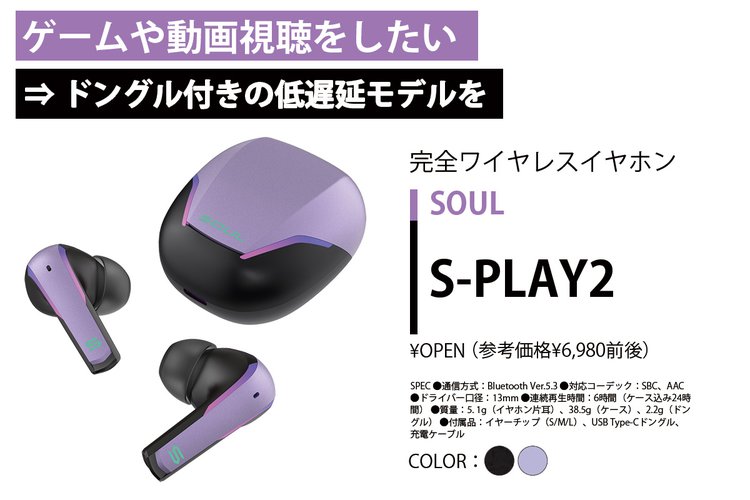 一般的なBluetooth接続に加え、通信ドングルが付属し2.4GHz無線伝送も利用できるのが特長。スマートフォンやゲーム機にドングルを接続すると、Bluetoothよりも音声が低遅延で、ゲームプレイも違和感無く楽しめる。また、2.4GHz 対応で税込6,980円前後という価格設定は破格といえ、自社工場で大量生産を行うSOULならではのアドバンテージといえる。