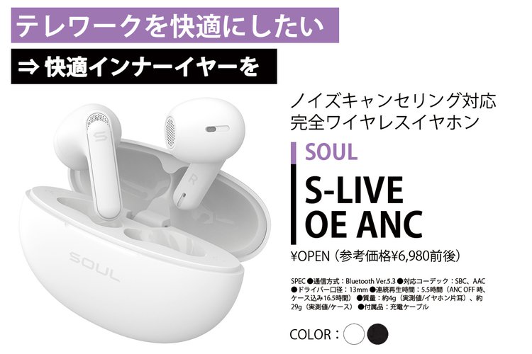こちらは耳の窪みに掛けるように装着するインナーイヤータイプ。マルチポイント接続に対応するのでPCとスマホの切り替えが可能なのと、耳にのせるだけなので長時間の装着も快適。ノイキャン機能も搭載しているので、仕事に集中したい時に最適だ。小型軽量ながらSOULらしい重低音サウンド、均整のとれたサウンドバランスも魅力だ。