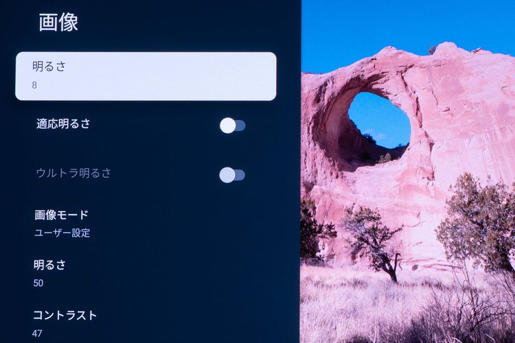 さらに「明るさ」を8や7に設定して、「モーション補正」をオフにすると、これだけで快適に1時間の夜の東京空中散歩を楽しめる。さらに追い込みたい場合は、画像モード「ユーザー設定」にし、色温度やコントラストを調整していくと、夜景のギラツキがほどよく馴染んだウェルバランスを得られる。