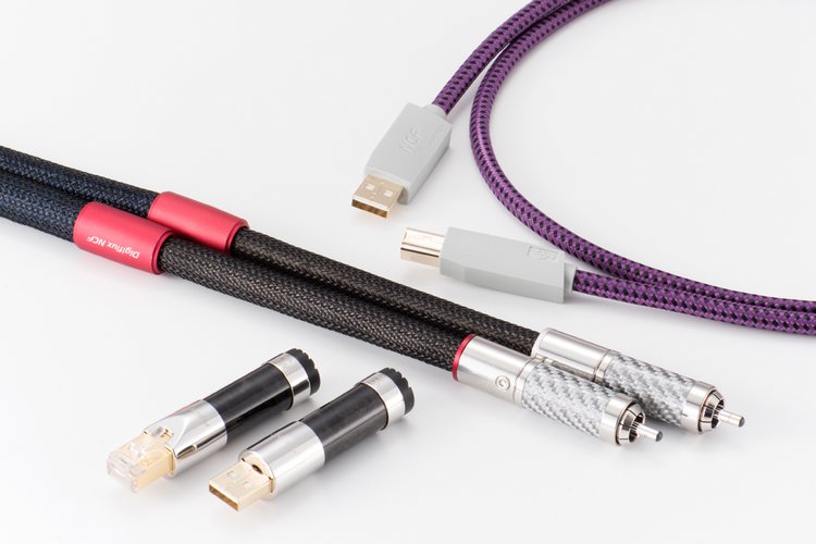 最後は「Digiflux NCF(RCA)」、受注生産のデジタル同軸ケーブルである。導体はαOCC、シールドはαOCC導体の編組。RCAコネクターはαOCCロジウムメッキのワンピース構造導体ピンに、耐熱性NCF液晶ポリマーを注入。ハウジングは非磁性ステンレス鋼ハウジングにハイブリッドNCFシルバーメッキ3kカーボンファイバー、最外層にハードクリアコートを施している。