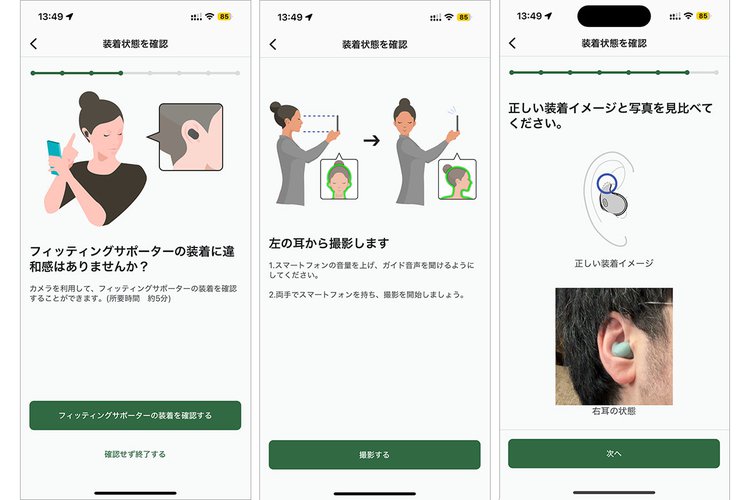 ただし普通のカナル型と装着感覚が異なるため、正しい装着位置が最初は少しわかりにくい。そこで「Sony Sound Connect」アプリには「装着状態の確認」機能が用意されている。画面の指示に従って装着時の自分の耳周りをスマホカメラで撮影。すると装着状態の判定や正しい装着状態への案内を行ってくれる。使い始めのうちはこの機能に頼ればOKだ。