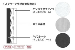 価格を超えるハイスペックさもポイント。幕面には独自開発の4K対応生地「ハイビジョンマット2」を採用しており、2枚のPVCでガラス繊維を挟み込む三層構造とすることで、中間層のガラス繊維を細く高密度化でき、高精細な映像を再現できるという。また、表面のPVC生地にはきめ細かいエンボス加工を施すことで、高精細な4K映像を受け止めてもモアレが発生しないように配慮されている。