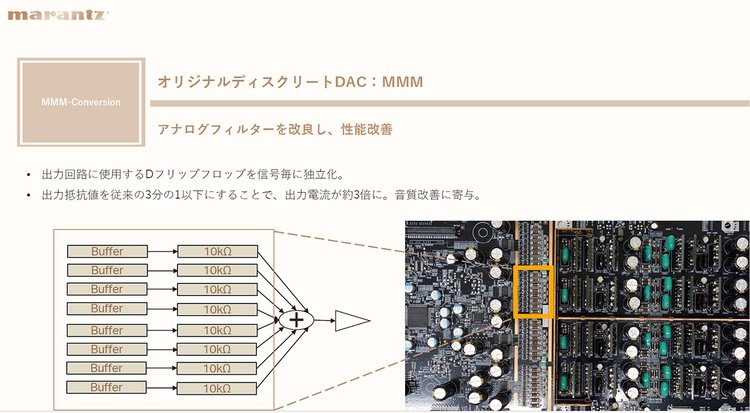MMMはアナログフィルター回路のバッファICと抵抗の構成を見直すことで、出力電流の向上と低ノイズ化を実現するなど、最新世代に進化。アナログオーディオ回路は左右対称配置とし、L/R ch間に銅板のセパレーターを配置するなど、ノイズ対策もきめが細かい。