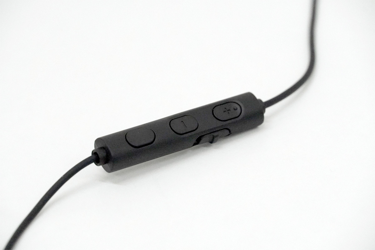 R側のイヤホンの下にはマイク付きリモコンが用意されており、通話用のヘッドセットとしても使用可能。イヤホンを装着した際に自然と口の近くに来るので集音しやすく、位置的に目で見て操作するのは少し難しいのだが、ボタンに突起が付いているため慣れればノールックで簡単に操作できる。側面にはミュートスイッチも付いているので、PCやスマートフォン側でミュート操作を行わなくても咄嗟に切り替えができて便利だ。