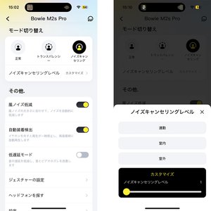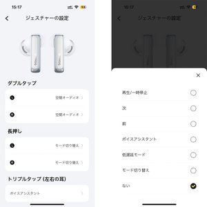 こうした機能の操作をサポートしてくれるアプリの出来もよい。上記の機能以外に、イコライザー設定、タップ(タッチ)操作の機能割り当ての変更なども可能。本機には元よりシングルタップ操作が無い上、ダブルタップなど他の操作にも機能を割り当てない設定ができるので、タップの誤動作を防ぎたい方も安心だ。