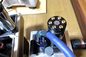 オプションの「ACXR GROUND CABLE」のバナナ端子側を「ACXR」本体に6つある穴のいずれかに挿し、RCA端子側をシステムの任意の空きRCA端子に挿すと、オーディオシステムの異なる電位差を「ACXR」で統一しノイズを抑えるというので試してみる。