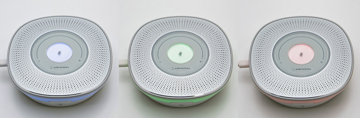 側面と天面にはLEDライトが備えられており、電源オンで青、ZOOMやGoogle Meetなどの会議ソフトに入ってマイクがオンの状態では緑、マイクがミュートなら赤といった具合に色が変わる。会議室に同席している全員にマイクの状態が一目瞭然なため、参加者が発言タイミングを把握しやすいのもメリットと言える。