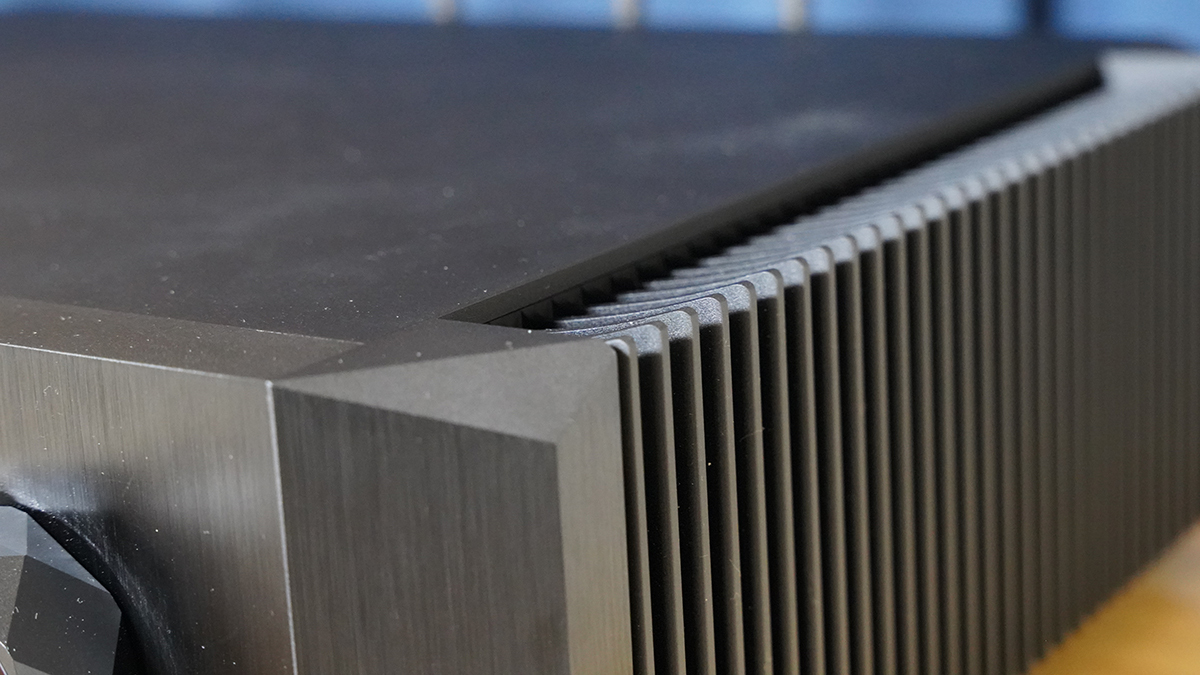 筐体の進化もDMP-A10にとって重要なポイントだ。コンパクトなDMP-A6、フルサイズと言うには少々足りなかったDMP-A8に対して、DMP-A10は430mm×310mm×117mmの堂々たるフルサイズ。今まで以上に分厚く、エッジの効いた意匠が施されたフロントパネルや、デザインの一端を構成するサイドの放熱フィンなどは本機の存在感を大きく高めている。
