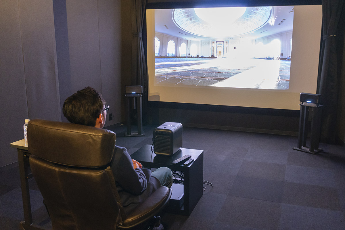 音元出版の視聴室・ブラック、完全暗室の環境下で「Nebula X1」を体験し始めると…、その画質性能は極めて優秀だ。