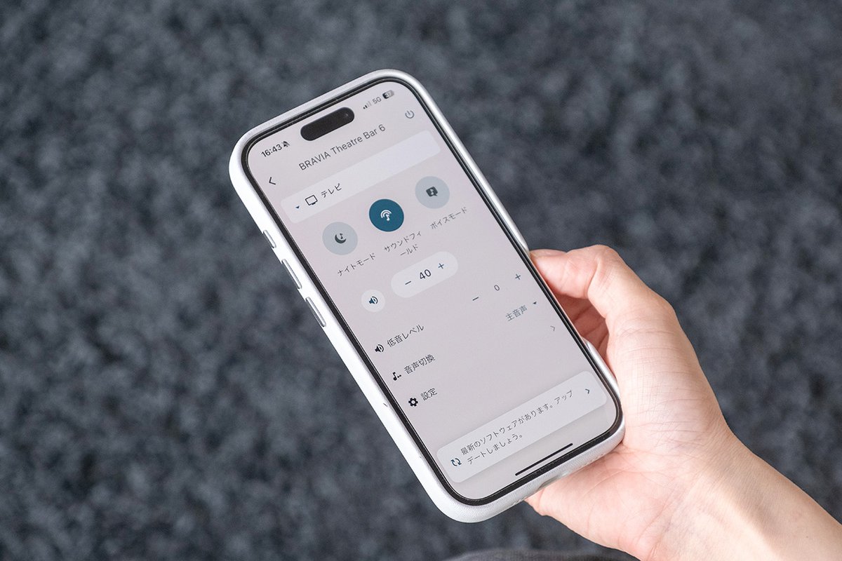 Bar 6は、専用アプリ「BRAVIA Connect」から、セットアップなど各種設定を簡単に行えるのも良い。UIが見やすく使いやすくて、筆者も音量調整などの操作は基本的にこのアプリから行った。サウンドフィールド機能のON/OFFや、サブウーファーの低音の量感も10段階で調整可能。2種類の音声モード(ボイスモード/ナイトモード)の切り替えもでき、コンテンツに応じてサウンドを最適化できる。