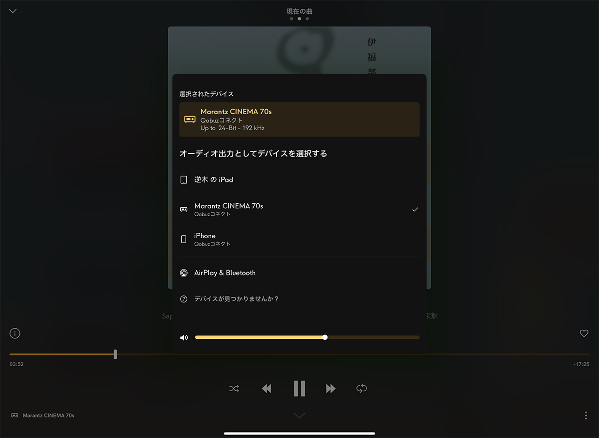 楽曲の再生時、曲名の右に出てくるスピーカーのようなアイコンをタップすると、出力先を選択することができる。ここで「CINEMA 70s」を選択すればOK。出力先だけがCINEMA 70sに切り替わる。