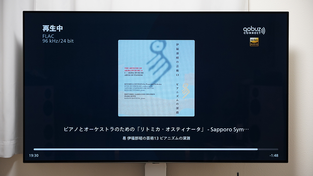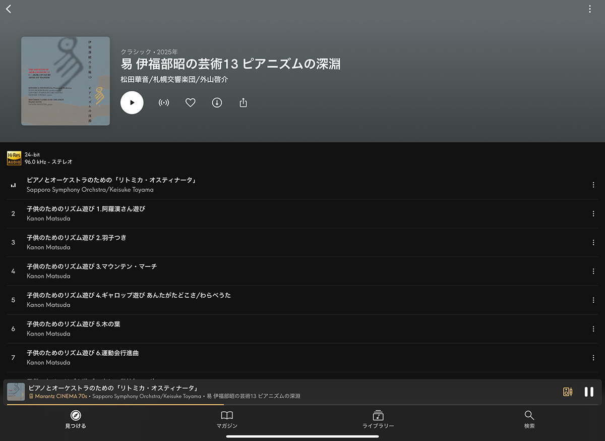 まずは新譜で見つけた『易 伊福部昭の芸術13 ピアニズムの深淵』から「リトミカ・オスティナータ」(96kHz/24bit)を聴く。この曲は筆者にとって非常に思い入れの深い曲であり、ハイレゾで新譜が出るというのはタイミングも含めて非常に嬉しい展開だった。