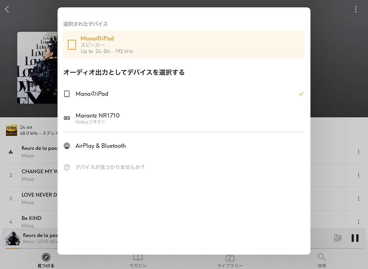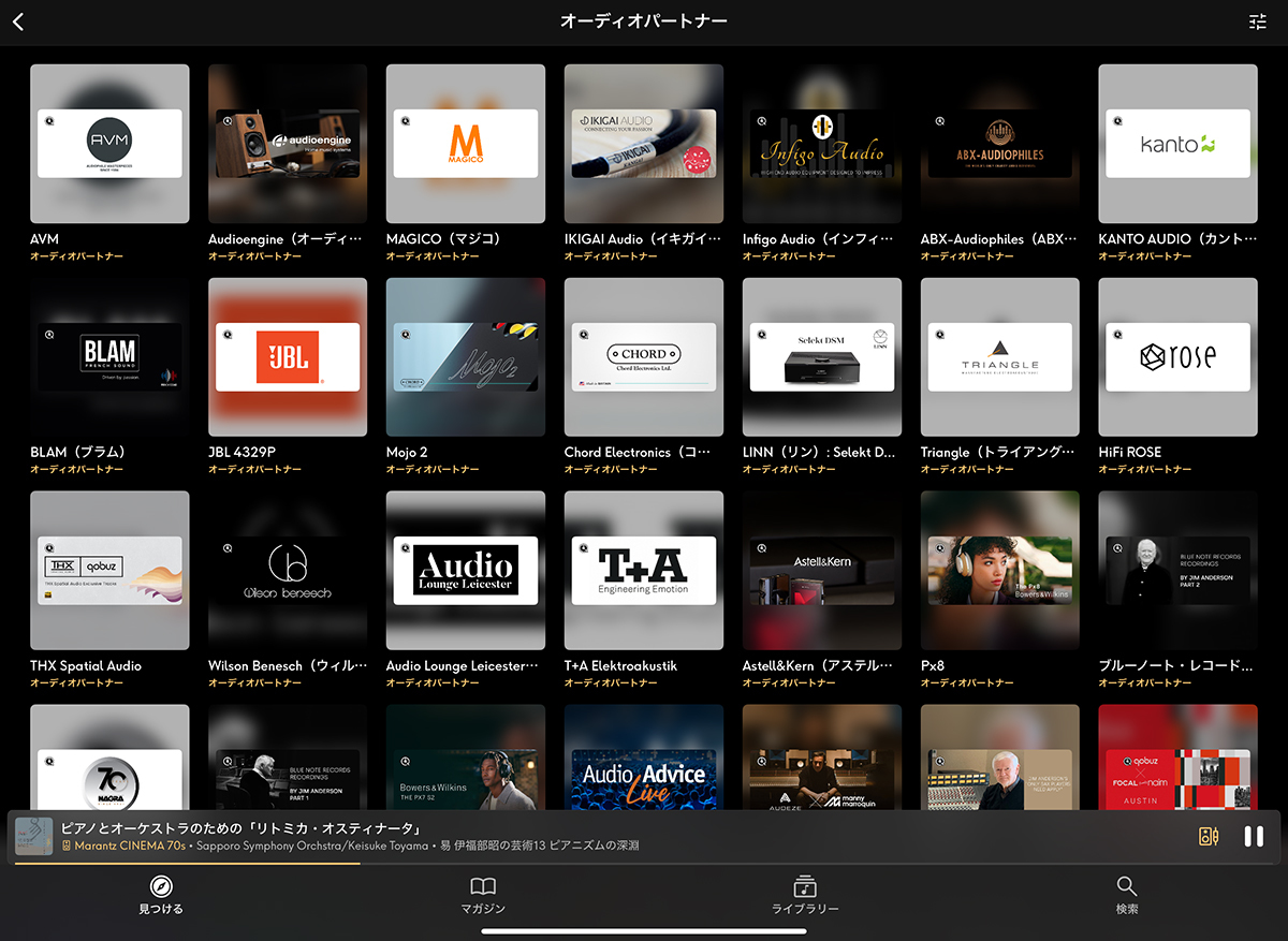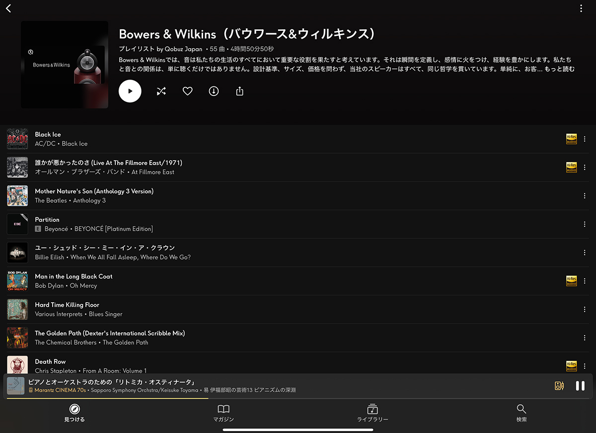 続いて、Qobuzは「オーディオパートナー」というプレイリストのカテゴリを用意していることが大きな特徴となっているのだが、そこから「B&W」のプレイリストを選び、B&Wのセレクションからジェフ・バックリー「Hallelujah」(192kHz/24bit)を聴いた。このように、「Qobuzが用意しているコンテンツにスムーズにアクセスする」という点においては、言うまでもなくサードパーティー製のアプリよりも、Qobuz公式アプリに優位性がある。