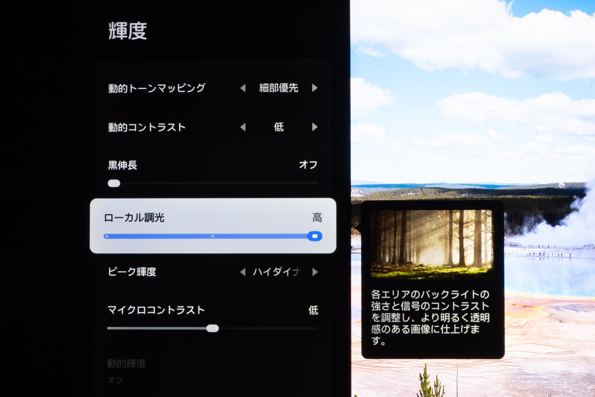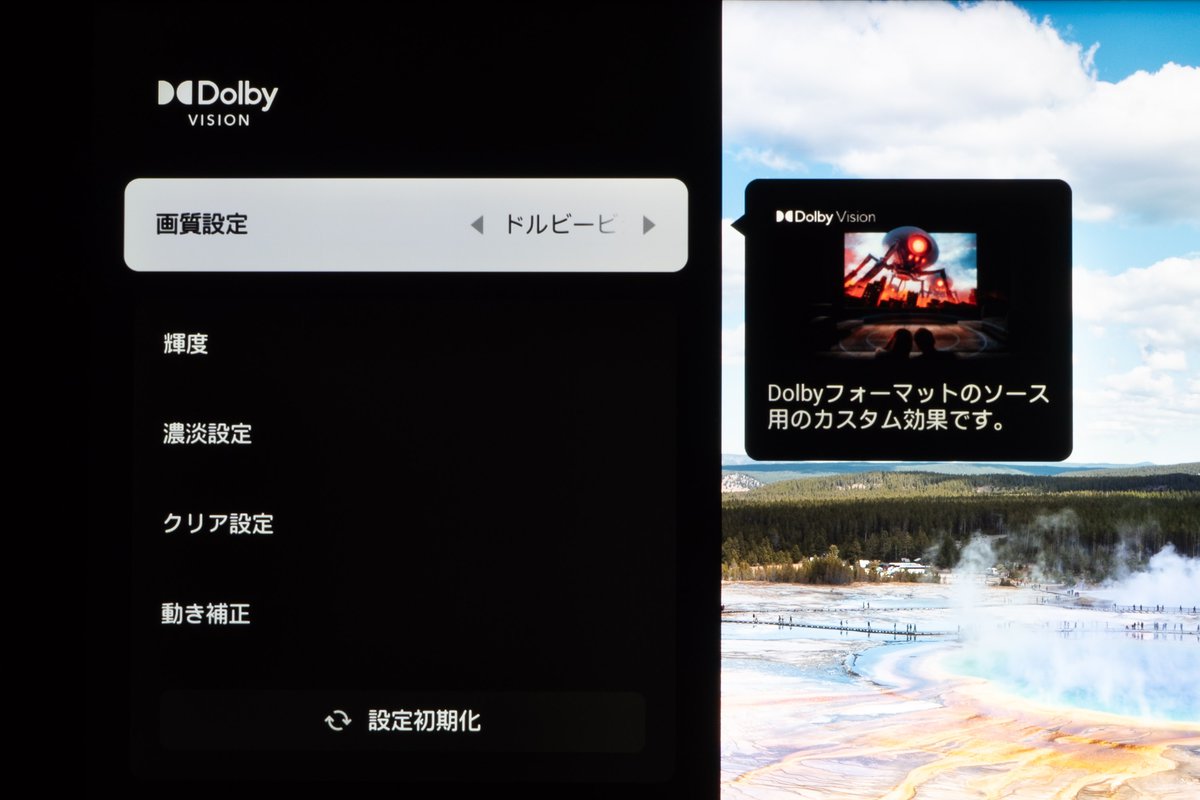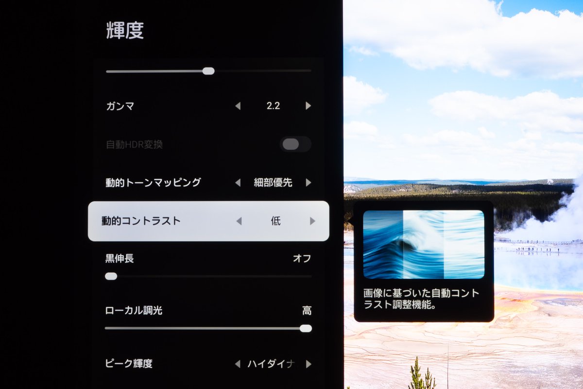 これはパネルのネイティブコントラストの高さによって色が薄まらないことに加え、ローカルディミングの巧みさが推し測れる。明暗は従来の16ビットを遥かに超える23ビット、つまり800万段階以上 でコントロールされるとのことで、アップグレードされた「DLBアルゴリズム」などと併せ、均衡の整った映像美を魅せつける。
