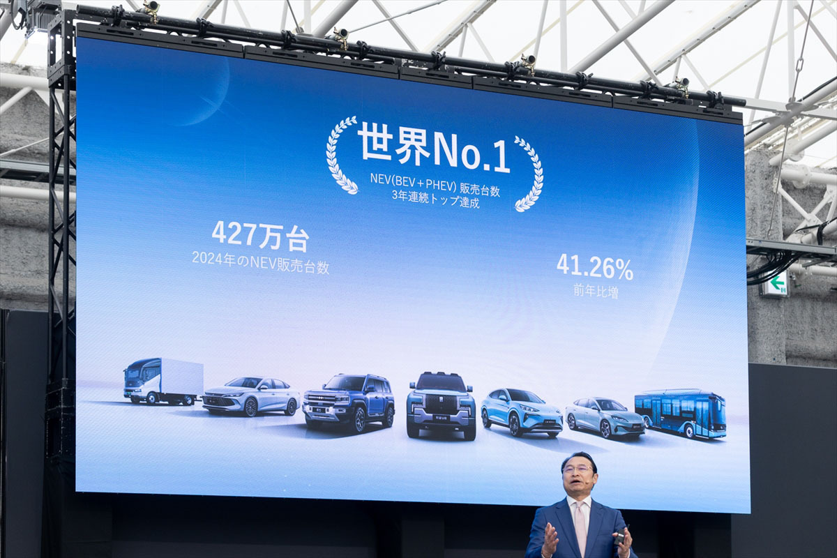 1995年、バッテリーの製造メーカーとして産声を上げたBYD。携帯端末などの普及などの波にのり事業は急成長し、創業から僅か8年の2003年に中国国営の自動車メーカーを買収するや、電気自動車に注力。2024年には約427万台のNEVを販売し、名実ともに世界ナンバーワンのNEVメーカーに急成長した。ちなみにロンドンの名物である二階建てバスもBYD製である。