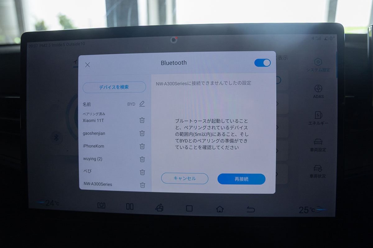 ならばと有線接続を試みるも、NW-A300シリーズが搭載するAndroidシステムが、かなり特殊であるためか通信は叶わず。これはBYDに限った話ではなく、他の自動車メーカーの純正システムでもNW-A300シリーズとの間で通信できないことがある。このようにDAPと車両によっては相性があるので、気になる方はディーラーなどで事前に確認されることをオススメする。