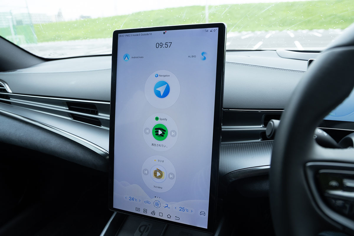 センターに置かれた大型のタッチパネルディスプレイは縦横の回転が可能で、車両設定をはじめ、ほぼ全ての操作を行う。ちなみに縦画面状態ではAndroid AUTOが起動しないので注意が必要だ。
