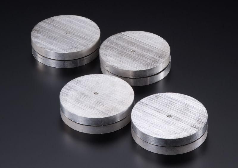 サンシャインは常に私たちへお手頃価格で効き目の大きなアクセサリー・グッズ類を提供してくれるが、今回の新製品は純度99.95%のマグネシウム円盤2枚の間に超薄型の制振シートが挟み込んである、4個1組8,800円(税別)という、にわかには信じられないような価格のインシュレーターである。スパイク受けに使える窪みも穿たれているので、レファレンス・スピーカースタンドのスパイクを受け、音を聴いてみた。