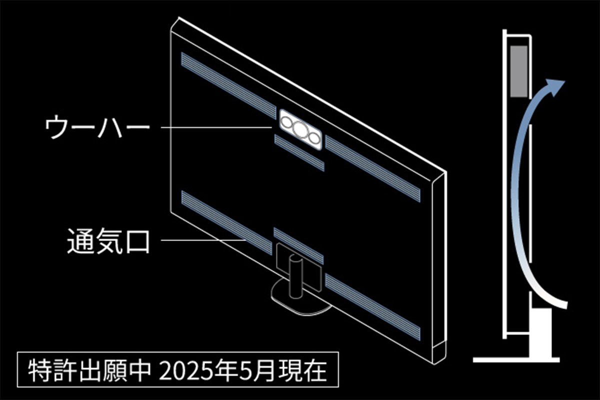 これは、自動車開発などで用いられる流体力学(エアロダイナミクス)の知見をパネルの放熱設計に応用したもので、数値流体力学シミュレーションを駆使してテレビ内部の空気の流れを徹底的に解析し最適化。これにより、パネルの温度上昇を効率的に抑制し、高輝度状態でも安定した映像表示と、パネルへの負荷低減を両立させている。