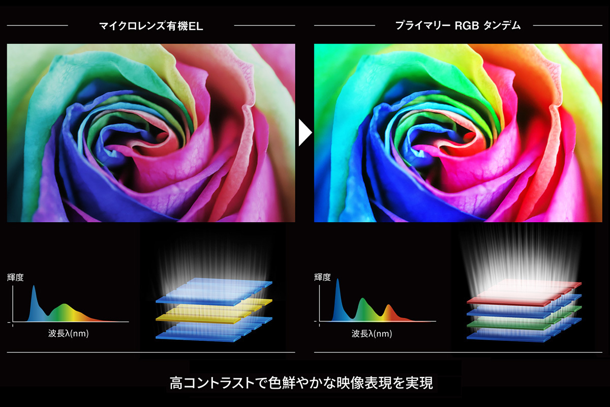 これは、発光層を従来の青・黄・青の3層構造から、赤と緑の発光層を独立させ、新しい蛍光体を用いた2層の濃い青色の発光層を間に挟む全4層構造へと変化させたもの。これにより、光の三原色であるRGBそれぞれの純度を高め、より鮮やかで正確な色彩表現を可能にした。とくに赤色の表現力向上は目覚ましく、従来課題とされてきた黄色みがかった朱色ではなく、より純粋で深みのある赤色を再現している。