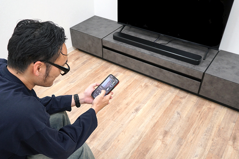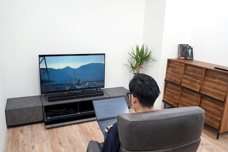 視聴コンテンツは、劇場と同じくトム・クルーズ主演の『トップガン マーベリック』。チャプター1、空母の甲板上のシーンから再生を始めると、そのコンパクトな見た目からは想像もつかないスケールのサウンドが部屋を満たす。音はテレビ下に置かれた本体からではなく、左右の壁際まで大きく広がり、高さ方向の表現も伴う。