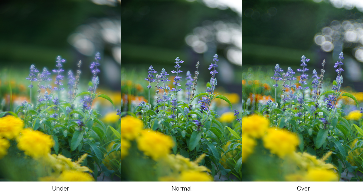 球面収差をオーバー側、アンダー側に可変させた場合の描写の変化を文字で説明するのは難しいが、大雑把にいうと、ピントを合わせた被写体に対し、オーバー側では前ボケが自然な感じになり、後ろボケはいわゆる ”バブルボケ” といわれる輪郭の立ったものになる。一方、アンダー側では後ろボケが柔らかな感じになり、全体に被写界深度は深く、ソフトフォーカス調の描写になる。