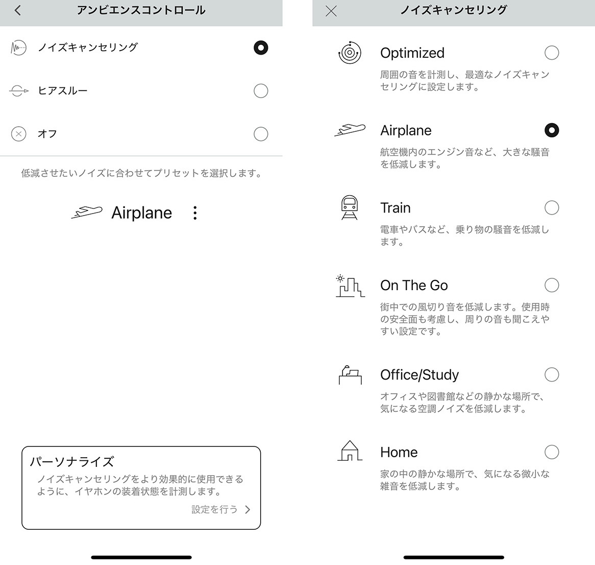 本機には周囲のノイズ環境に応じてANCのレベルを自動で最適化する機能がある。最初にアプリから自動計測を行って「ノイズキャンセリングのパーソナライズ」も済ませておくと遮音効果はさらに高まる。ANCのモードは「Optimized」を選んでおけばイヤホンが常時ベストなANC効果を引き出してくれる。