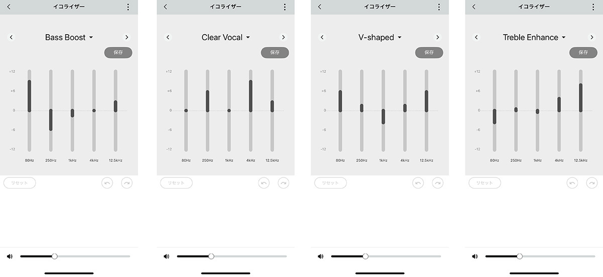 Connectアプリはイコライザー機能も備えている。4種類のプリセットや5つの音域ごとに調整した設定値をマイセッティングとして保存すれば繰り返し使える。楽曲やリスニングシーンに合わせて本機のサウンドを微調整してもいい。