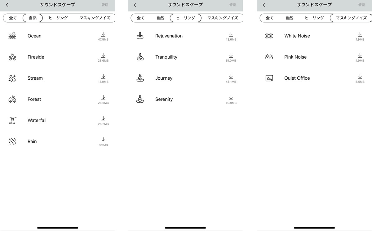 ユーザーの生活に寄り添う音もの機能として「サウンドスケープ」機能が搭載されたことにも触れておきたい。潮騒に焚き火、小川のほとりや森に漂う環境音など、イヤホンを装着して再生すると集中力が高まる複数の音源を収録している。