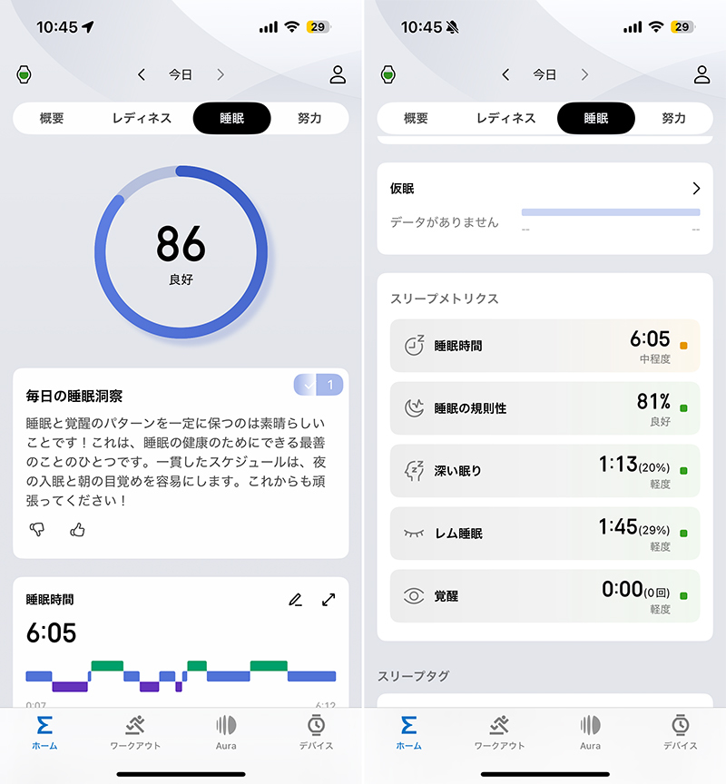 これは心拍数などセンサーから取得した情報による分析結果だが、睡眠時間はかなり正確で、過去2週間遡って確認しても実際の就寝/起床時刻に基づく時間とピタリ一致していた。夜間睡眠の規則性や、睡眠時無呼吸症候群のリスク値算出までしてくれるので、睡眠の質に悩む人には役立つはずだ。