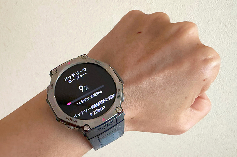 実際に使用してみると、やはりバッテリー駆動時間の長さには驚かされた。GPSやBluetooth、心拍センサーなど各種機能がオン、ディスプレイの明るさ約30%/スクリーンオン時間10秒という工場出荷状態ほぼそのままで、日中1時間あたり50件あたりの通知や各種アプリの利用など特に機能を制限しない状態で使用したところ、なんと2週間が経過した時点でもバッテリー残量は「9%」だった。
