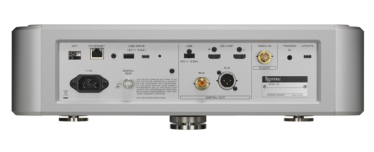 また、新機能としてESOTERIC Network Engine G4はネットワークスイッチ(ハブ)として機能し、イーサネットRJ-45端子、SFPポートの2つのインターフェースを装備しています。SFPに対応するネットワークスイッチやオーディオサーバー等と光ネットワーク接続することにより、ネットワーク経由のノイズ(主にアースライン)から信号をアイソレートすることで、よりピュアな再生ができるわけです。