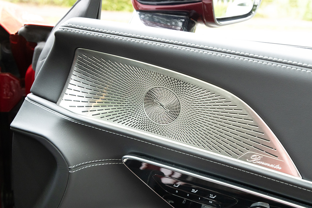 メルセデスAMG GT43は上質でスポーティな室内だけでなく、エンターテインメント(カーオーディオ)にもぬかりのない装備を揃えた。それがスピーカーユニット11基、パワーアンプ出力600Wというブルメスターのシステムだ(編集部注:日本ではブルメスターはアンプ等のエレクトロニクスを中心に導入されているが、本国ではスピーカーも数多くラインナップしている)。