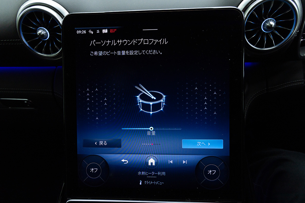 他社にはない機能で最もユニークなのは、好みの音を創るのに役立つ「パーソナルサウンドプロファイル」機能。車両を止めた状態で実際に様々な音を聴きながら質問に応える形でレベル調整をしていくと、その人に合った好みの音調バランスになるという。今まで様々なカーオーディオに触れてきたが、そのような機能は初めて。試してみるとバランスだけではなく、音の立ち上がりなどが大きく変化する。